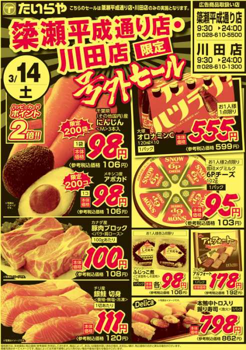 こちらのお店の情報は、チラシプラス運営会社のセブンネットが独自に収集した情報を掲載しています。最新情報と異なる可能性があることをご理解ください。掲載情報に間違いがございましたら、「こちら」よりご報告をお願いします。